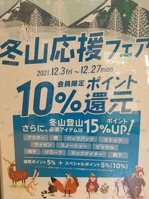 こんにちは、イオンモール東久留米店です。 今日から好日山荘では冬山応援フェアを開...