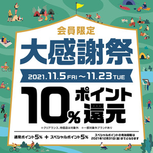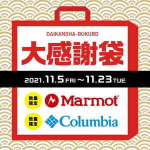 11/5(金)より 「大感謝祭」 開催しま~す! メンバーズポイント10%付与と一部人気ブランドはポイント15%付与! 新しい季節の準備に ぜひご利用下さい!さらに「マーモット」と「コロンビア」の感謝袋を限定販売!