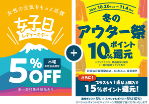 本日11/4は木曜日ですので毎週木曜日恒例のレディースデイです。好日山荘メンバーズカード会員様で女性の方が得する一日です。更に姫路駅前店限定の『テラッソ姫路リニューアルオープンフェア』最終日です。
