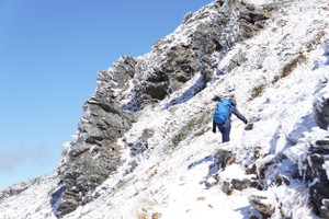 山頂付近で、 水たまりに氷が張るくらい 気温が下がり、風も寒い時期のハイキン...