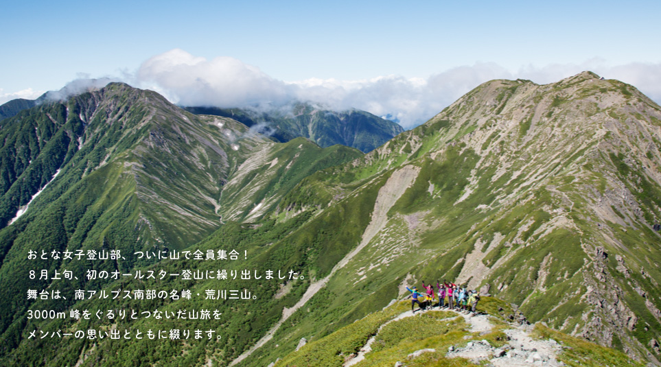 この夏おとな女子登山部が向かったのは、南アルプスのなかでもより山深い、南部に位置する荒川三山。悪沢岳(東岳)(3141m)と中岳(3084m)、前岳(3068m)の3座のことで、あわせて荒川岳とよばれています。椹島を拠点に千枚岳(2880m)、赤石岳(3121m)とあわせて訪れる人気コースを、反時計まわりで歩きました。