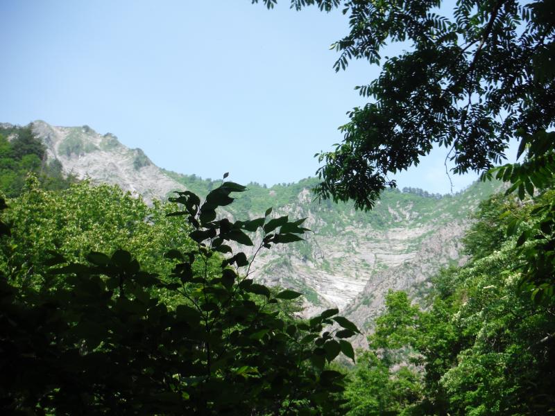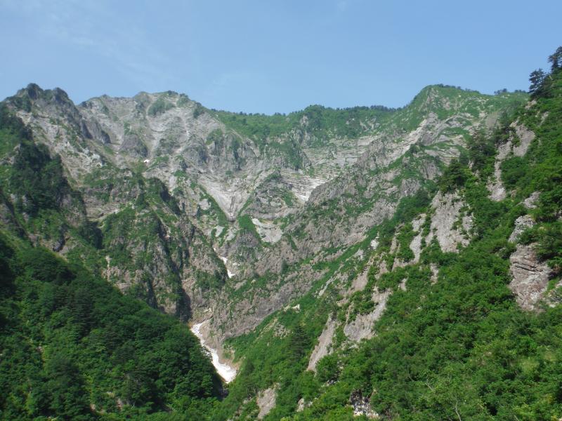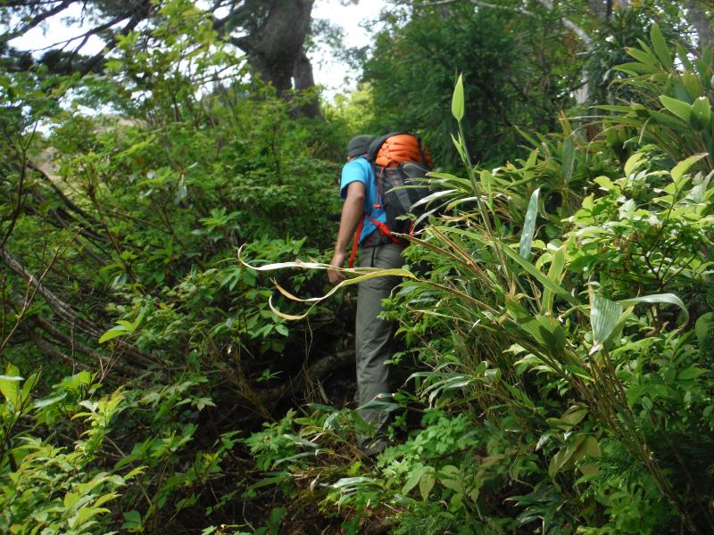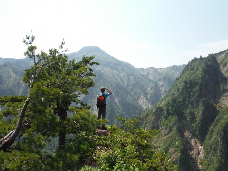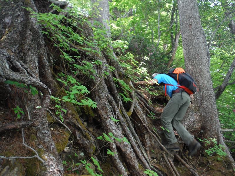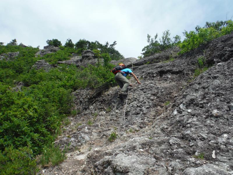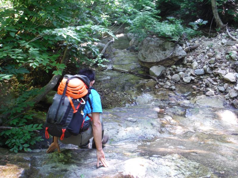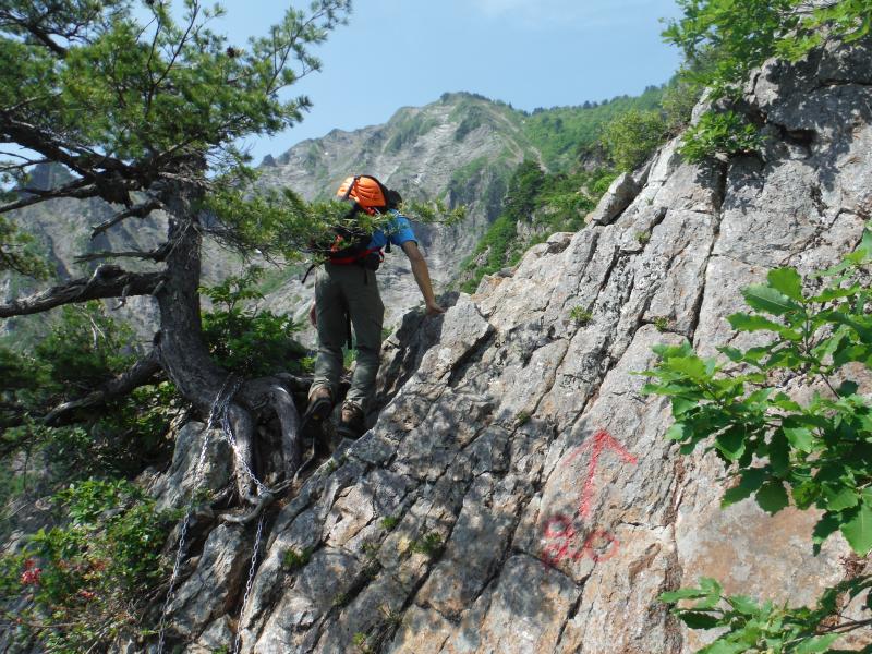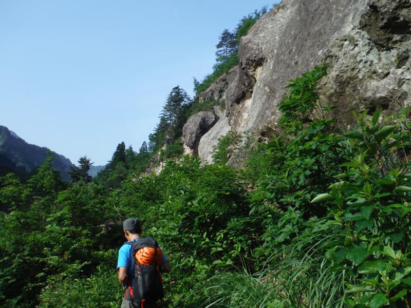 湯沢の出合を過ぎると、木々の間からスラブの大岩壁が見えます。こんな所にこんな景色が広がっているなんて驚きです。人里離れた遠くの秘境までやってきたような気分を味わえます。この先は急登と岩場が続き、高度が上がるにつれ暑さも増すのでバテないよう水分と塩分をこまめに摂るようにしました。岩場ばかりと思えば、ほぼ藪のような場所もありうんざり。ここでは長袖に手袋は必須です。