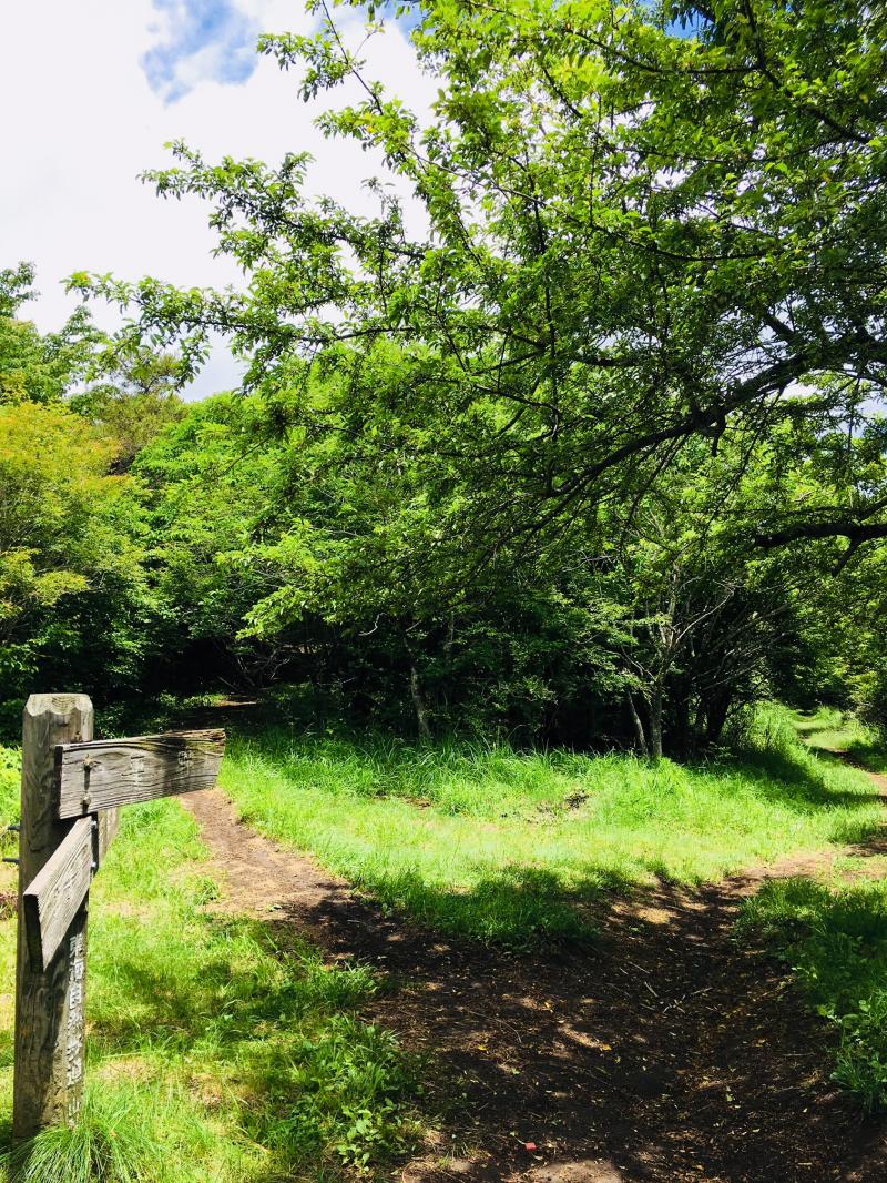 - 石割山ハイキングコース駐車場(20)東屋(25)石割神社(25)石割山山頂(25)平尾山手前の分岐(15)駐車場分岐(20)
