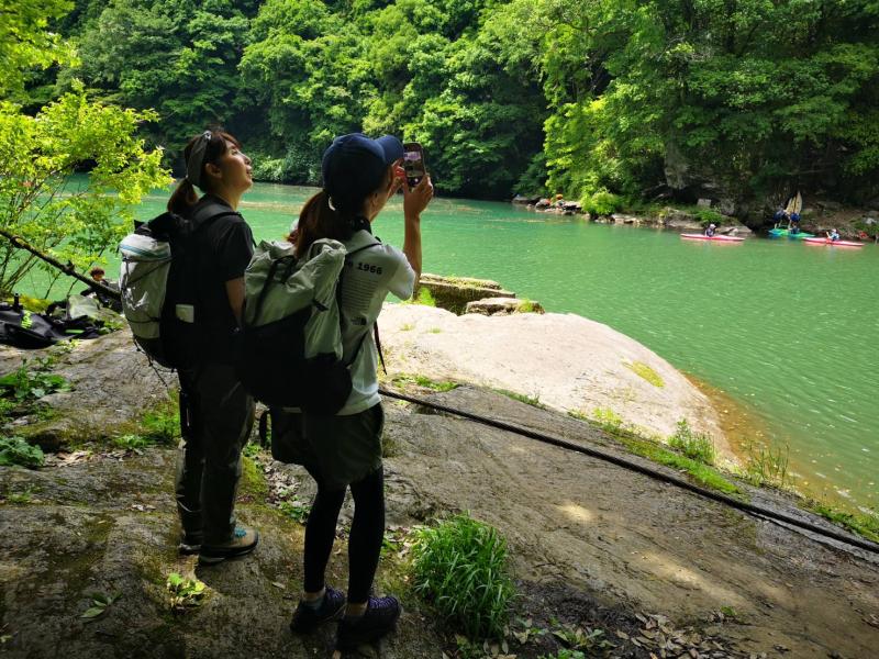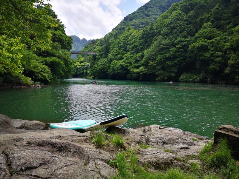 気になる森のハンバーグ屋さんを過ぎると、船乗り場がありカヌーやサップを楽しむ人々で賑わっていました。この辺の川面は日の当たり具合や角度によってはヒスイ色に見えてとても綺麗。写真を撮ったりしてしばらく景色を堪能しました。