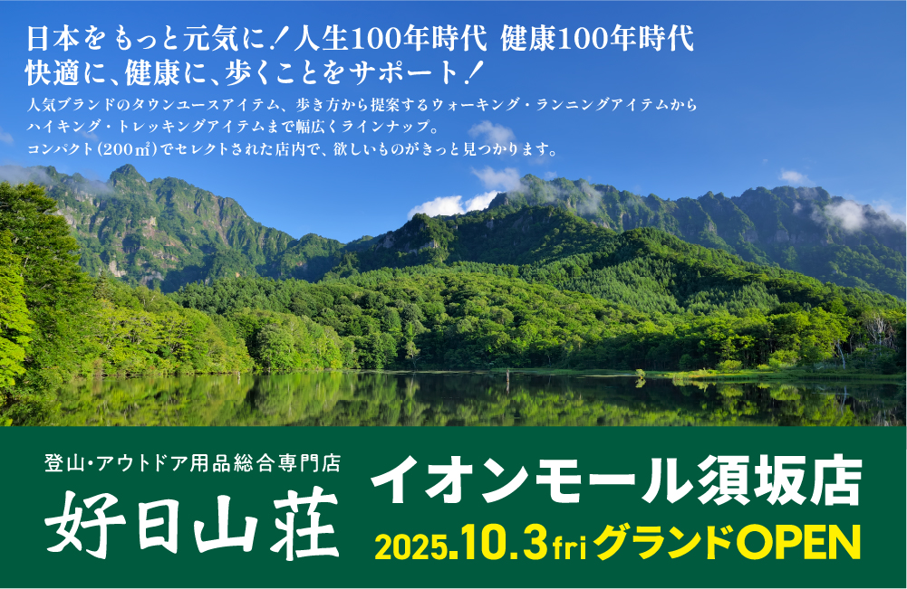 好日山荘では「日本をもっと元気に!! 人生100年時代、快適に、健康に、歩くことをサポートする」ために、登山人口の創出と健康寿命の延伸に取り組んでおり、ハイキングやウォーキングなど、地域のニーズに合わせた店づくりを幕張ベイパーク店では行ってまいります。