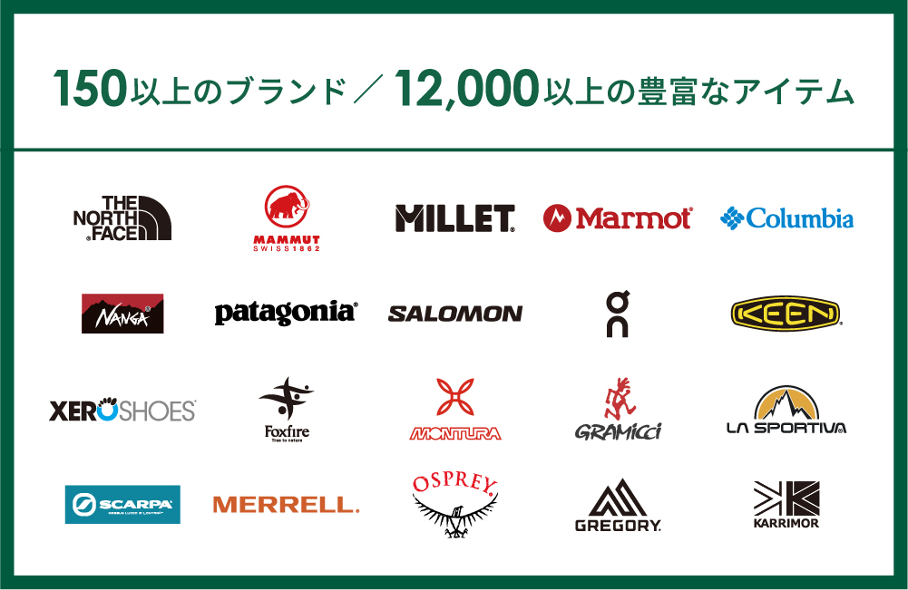150以上のアウトドアブランド、12000以上の豊富な商品を取り扱い、