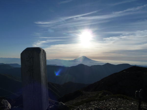 | 南アルプスは別名を赤石山脈、かつては海の底であった赤いチャートが混じる頂稜は朝日に赤く輝きます。黄金に光る雲海に浮かぶ冨士の高嶺が素晴らしい。 | |