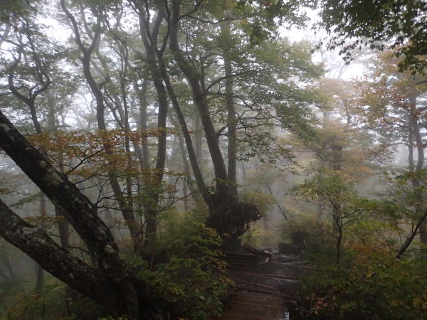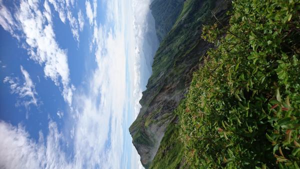 | 見上げる場所によって姿を変える伯耆富士。冬の厳しい環境に耐える背の低いダイセンキャラボクの林を過ぎると、北面の崩壊が著しい頂稜から日本海をみた後は往路を引返します。 | |