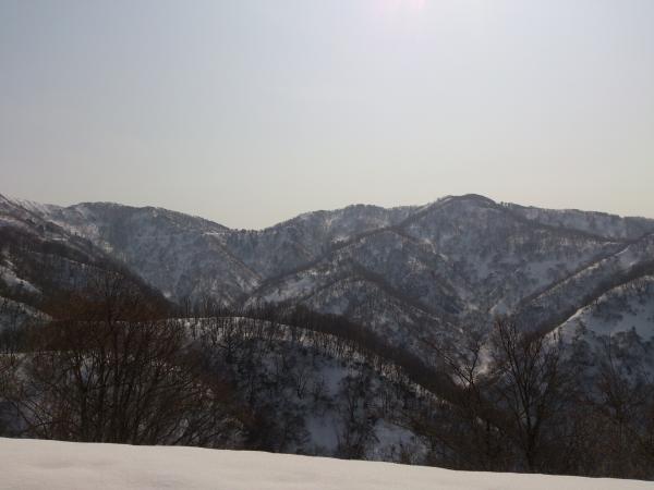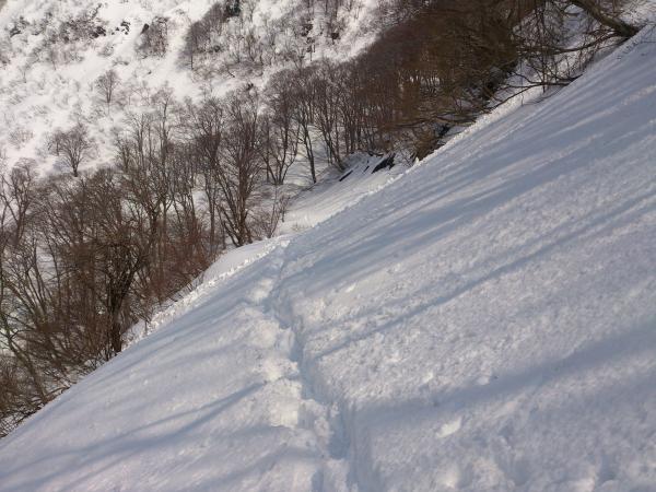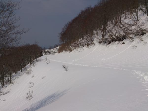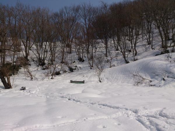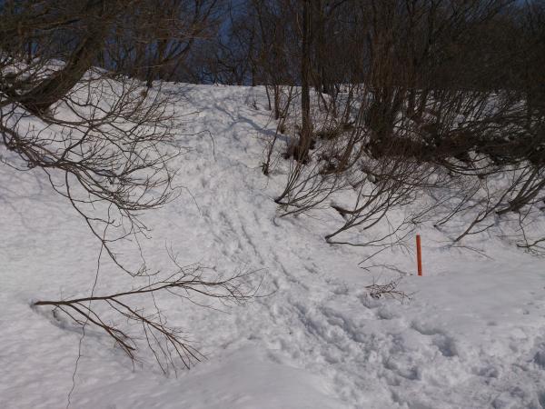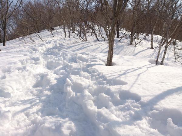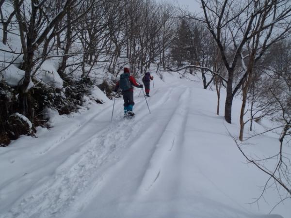 しがらくびから先の登山道はさらに雪が深くなります。この辺りからツボ足だときつくなってくるので、ワカンを使ったほうが楽ですね。スノーシューの方ははえている木が邪魔で使いにくいかもしれません。