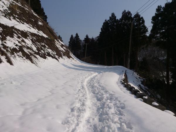 林道を歩き始めると明らかに先日よりも雪が深い。ちょっと湿った雪で、油断するとずるっと滑る。ですがまだスノーシュー、ワカンはなくても行けます。