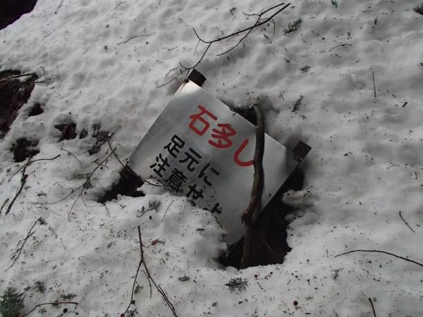 このコースは全行程道幅が広くて無雪期は迷うことはほぼないと思います。積雪のため、路面状況は確認できませんでしたが、一部「石多し」という看板がありましたので、気をつけて歩きたい場所もありそうです。