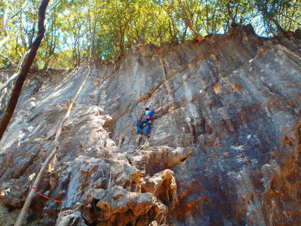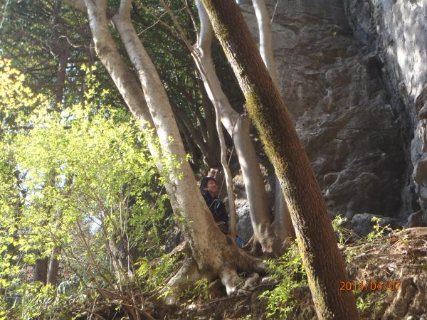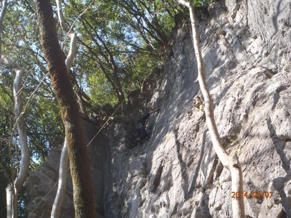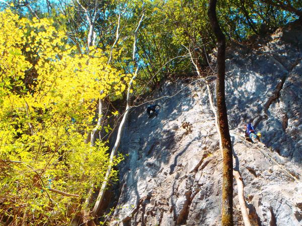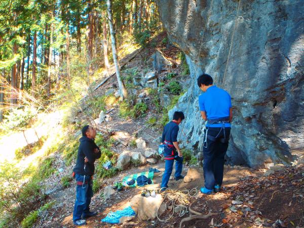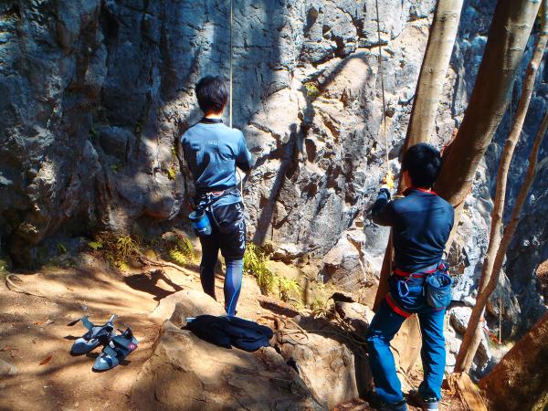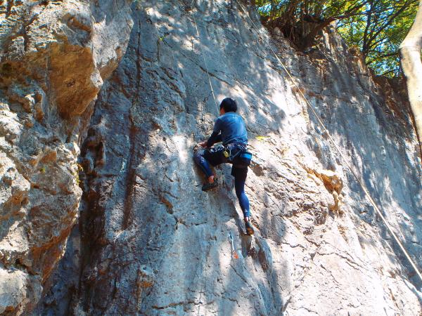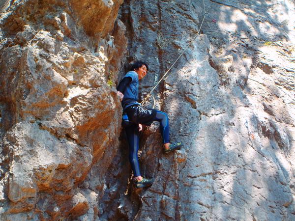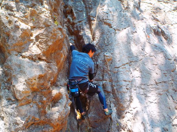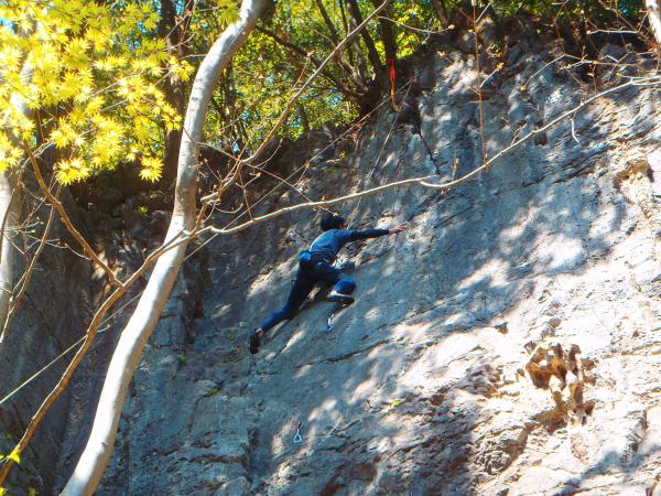 初の外岩ということで、高橋さんに案内していただき河又にトップロープでのクライミングに挑戦してきました。 初めに取り付いたルートは最初が核心になっており、グレードが5・11近くあるとのことですぐに諦め、隣の5・10a(後々に10cだったことが発覚)を登ることになりました。 丸茂さんがビレイヤーになってくださりスタート、出だしはまだ良かったのですが、上部のトラバースが核心でそこでフォールしガバを掴み粘りましたが、ここでバンプ… 何とか足を乗せ上がれましたが、かなり厳しかったです。 みんなに励まされ、上からの景色を少しだけ楽しめました。 帰りに登ったルートが 泣かないで愛ちゃん という5.10cルートだったことが発覚。 厳しくも楽しめたので良かったです。