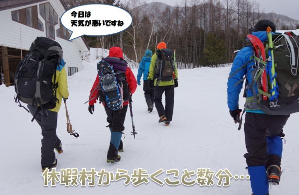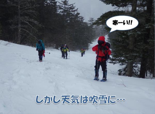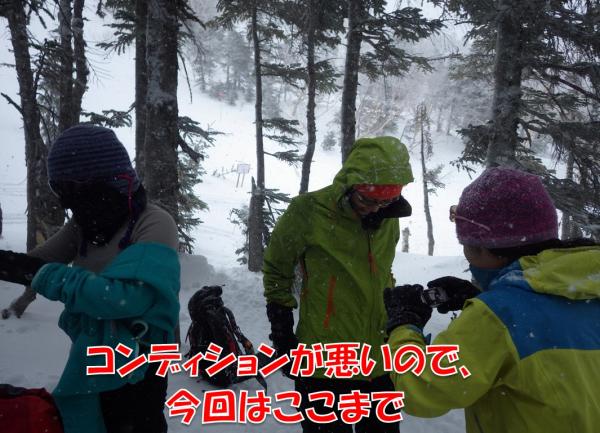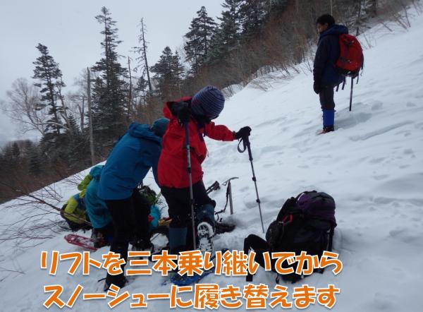 スキー場のリフトを利用して、スキー場の上部からスノーシューを履いて行動。位ヶ原付近まで行き天候の悪化も考え、今回はそこで引き返すことにしました。