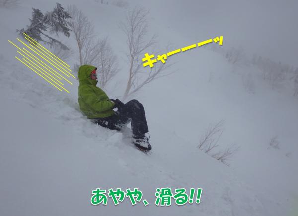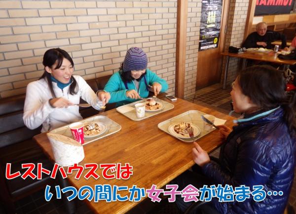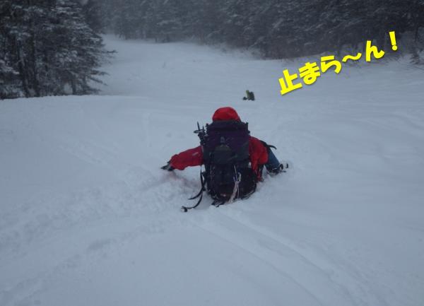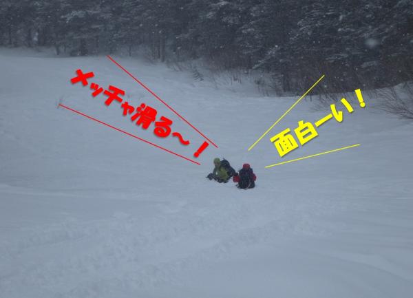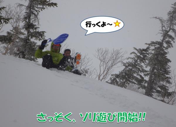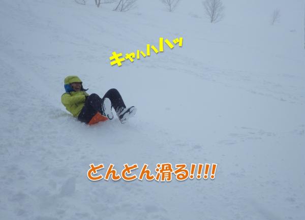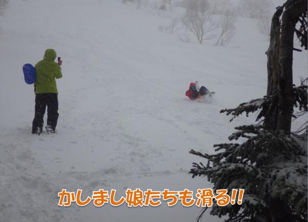 しばらく風の少ない木立で休みながら、みんなでソリ遊び。女性陣は大はしゃぎです。