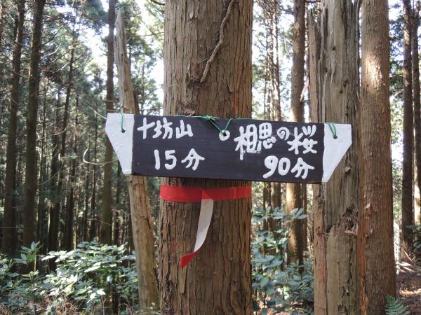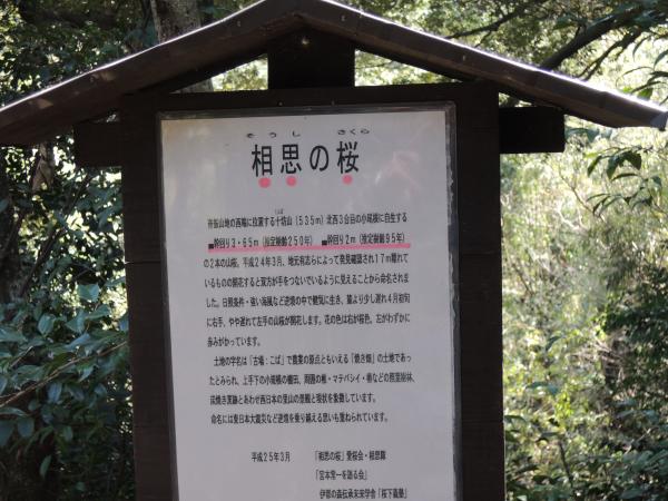 鹿家に下るコースを確認しながら山頂を目指して登り山頂手前10分程度の所に相思の桜の看板を見つけました。