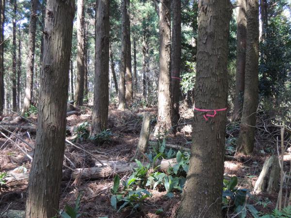 下りは相思の桜の目印に沿ってスギヤマの中の新たなコースを鹿家方面に杉山を下る。