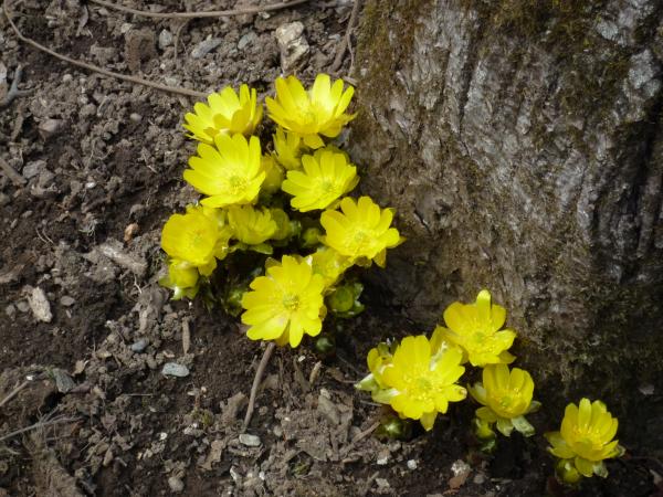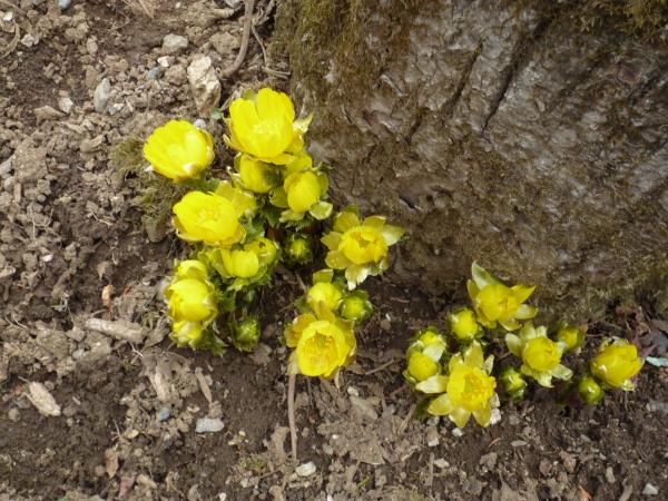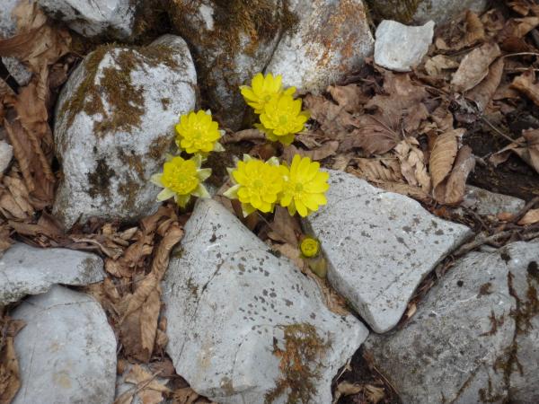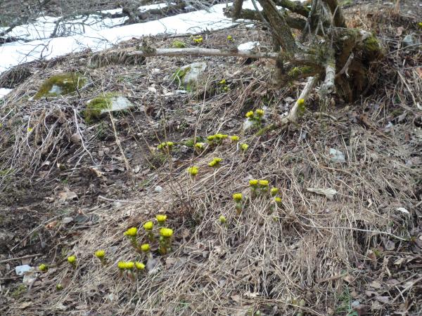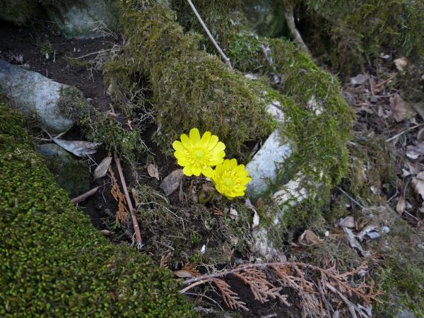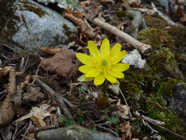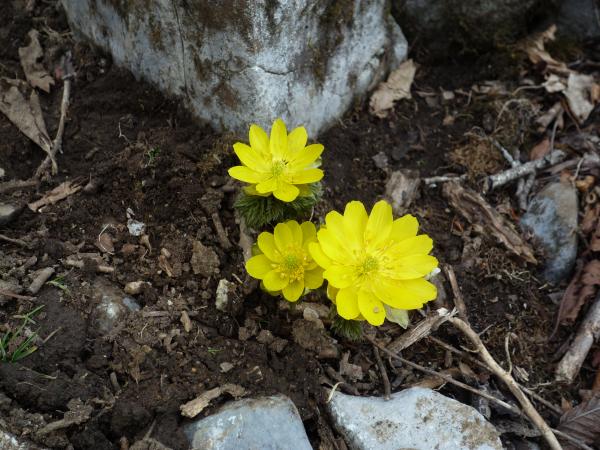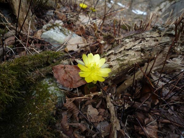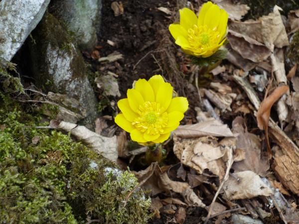大当たりとまではいきませんが、当たりでした。8~9合目付近に見事に群生地がありました。あいにく、日差しが弱い影響で全ての福寿草が全開とはいきませんでした。それでも、霊仙山よりも登山道に咲いているので、とても見やすいと感じました。