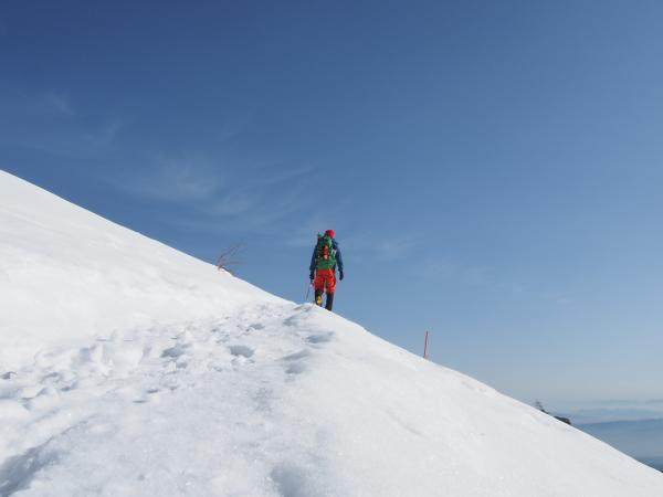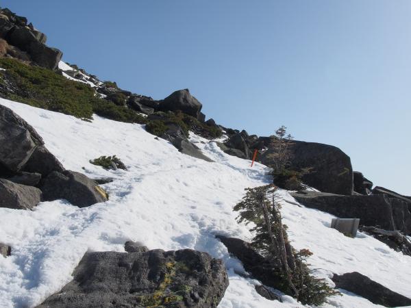 登り下りともに10本爪以上のアイゼン、ピッケル必須。