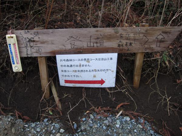 登山口をスタートし、なだらかな杉林を進むと治山工事を行っている林道に出ます。