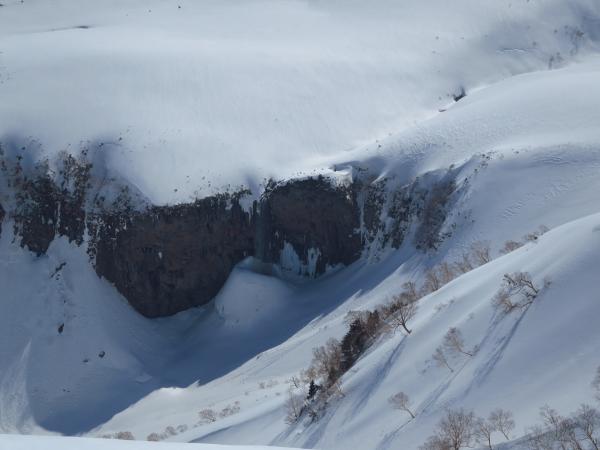 標高を下げると樹木も生えていたり、細い斜面を滑ったり、際どいトラバースがあったりして緊張もしたが、なんとか小さな転倒のみで、怪我なく滑る事が出来た。