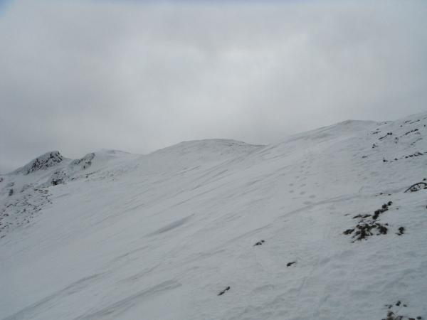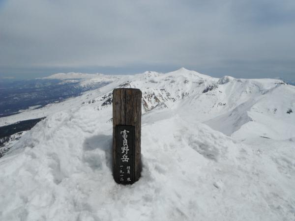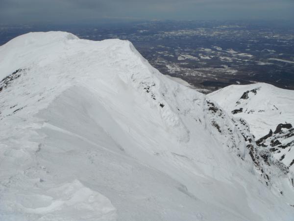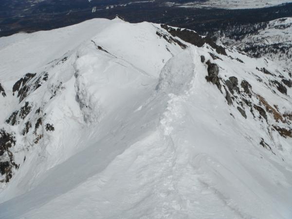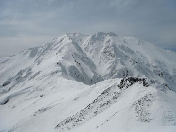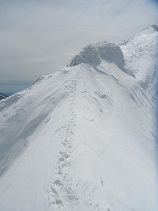 広大なべべルイ沢、鋭く尖ったホコ岩を左手に見やりながら、富良野岳頂上まで続く稜線へ取り付きます。ここからは先程とは違って本格的な雪山登山。急なアップダウン、両側が切れ落ちた細いリッジ。スキーを担いでの歩行は神経を削られます。強風だったら諦めていたでしょう。三峰山から続く十勝連峰の主稜線に合流すると広くなり、頂上はもうすぐ。北海道の山自身初登頂は富良野岳でした。