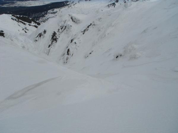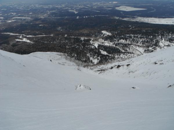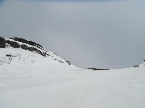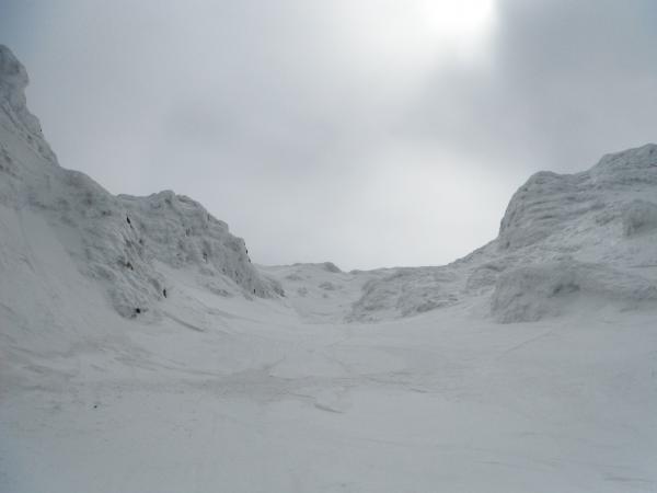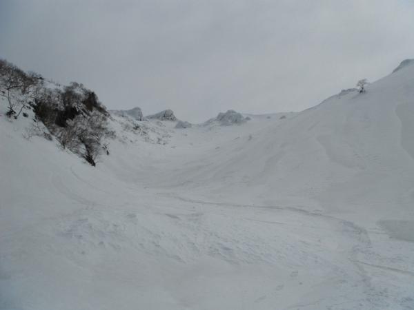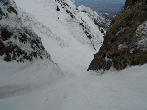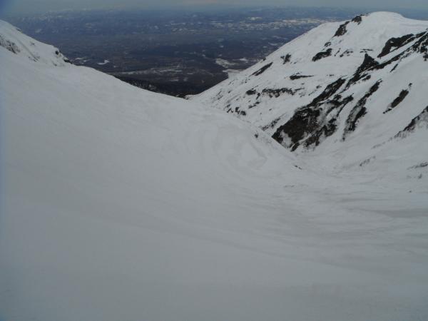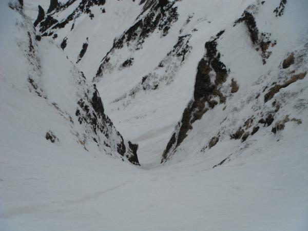 風の無い山頂で休憩し、ホコ岩から眺めて気になった頂上直下へ突き上げるルンゼへ。ホコ岩から見た感じと地形図を見た感じで、狭いけれどとくに障害物(岩、崖、滝、デブリなど)は無さそうだったので、滑ることに。遠くから見た感じでは壁のように見えましたが、近くで見るとそこまで急ではありません。雪も適度に柔らかくなっており、滑りに支障は無さそうです。意を決して雪庇の端からドロップ。とにかく狭い。両端の岩壁にぶつからないようにジャンプターンを駆使して無事にノドを通過。広い所へ出て、少し気が楽になったのも束の間、すぐにノド第二弾が出現。ノド奥が広くて緩やかなのが見えたので、直滑降で通過。その後は右側の岩尾根の末端まで滑り、末端を北に巻いた1550m地点でスキーを外し、ホコ岩まで登り返しました。