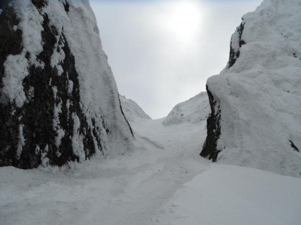 北壁ルンゼ…3mほどのノドが2ヶ所あり。全体的に狭い。転倒・滑落注意。