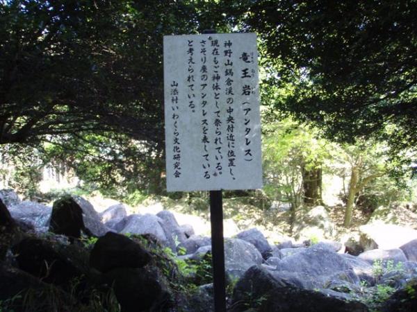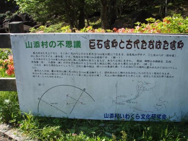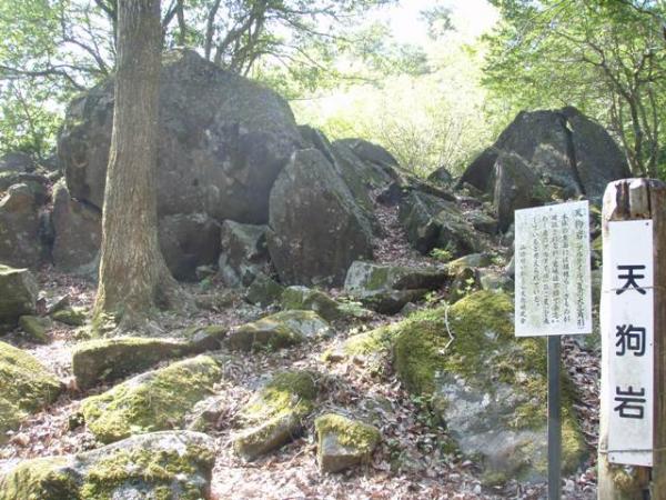 古代に信仰対象だった盤座(イワクラ)だと言われる複数の巨岩が残る神野山、その中腹から麓にかけては、溶岩の流れた川のように岩がぎっしり詰まっている鍋倉渓があります。伝説によると「伊賀・青葉山の天狗と神野山の天狗が喧嘩した際に、伊賀の天狗がどんどん岩を投げたので出来あがった」ということです。また神野山の岩の配列は、天体図の夏の大三角形と天の川周辺を投影したものではないかと言われているそうです。