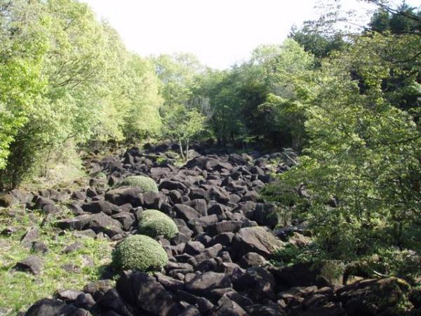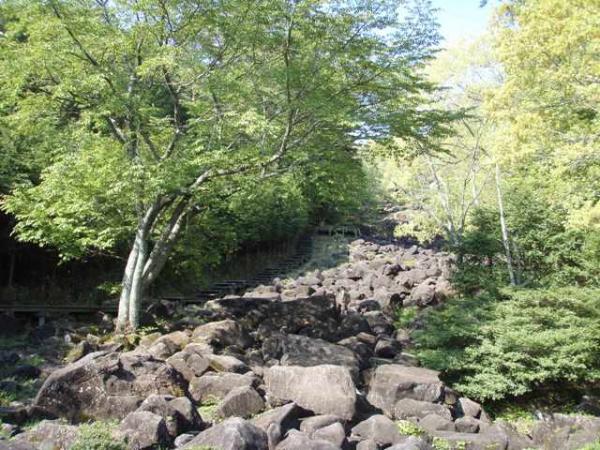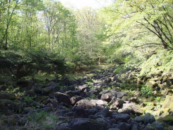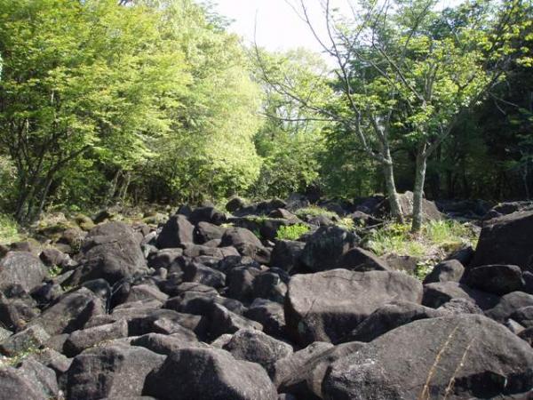 ということで、伝説や古代文明のロマンを感じさせる奇勝・鍋倉渓から入山。周囲は鬱蒼と木が茂り花崗岩っぽい岩肌なので、この場所だけ黒い大石がぎっしり詰まっているのは不思議な気がしました。伏流になっているので、下のほうからポコポコと水の流れる音が聞こえます。