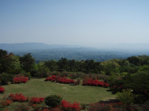 遊歩道を登って行くと竜王岩、天狗岩があり、アッという間にヤマツツジが溢れる山頂に到着。展望台からは360度の展望が望めました。一旦下って八畳岩を見てから山頂へ戻り、王塚の森へ。山頂に古墳があるのは結構珍しい気がします。茶畑の横を下っていくと、山の南にある神野寺に到着。天狗杉と呼ばれる巨大な杉に圧倒されます。
