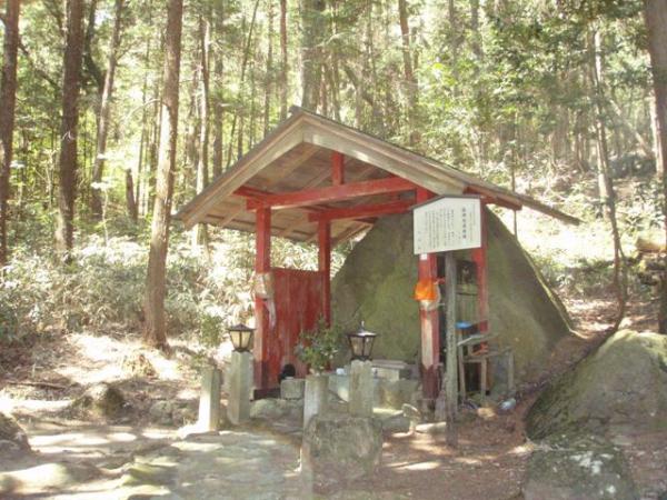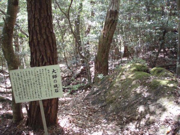弁天池の横を通り、森林科学館を経て、しばらく行くと左手にあるのが塩瀬地蔵。さらに進んで右手の藪の中に入っていくと、大師の硯石があります。上部にある窪みに水がたまっていますが、弘法大師が杖で穴を掘ると潮水が湧いてきたとか…。この水の増減を見ると伊勢湾の潮の満ち引きが分かると言い伝えられています。