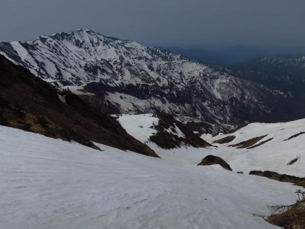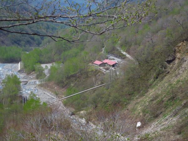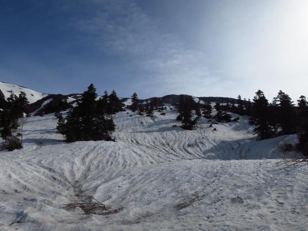 別当出合付近には全く雪は無く、中飯場手前の標高1450m付近からちらほら出てきた。