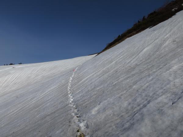 下山は、一部出ていた夏道は慎重に下るが雪の上になると歩幅を広げて一気に下山。