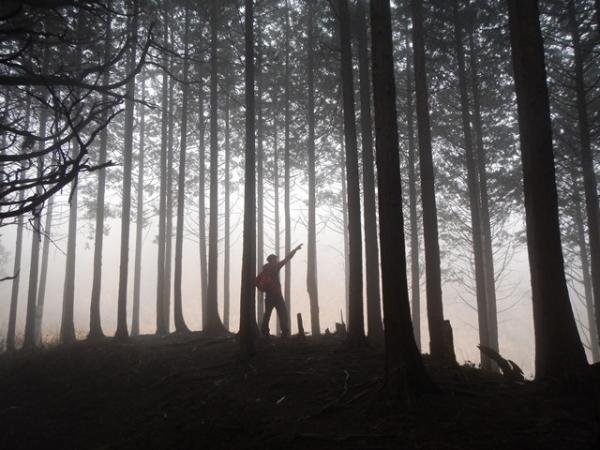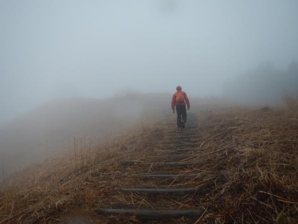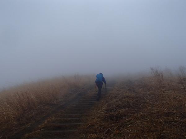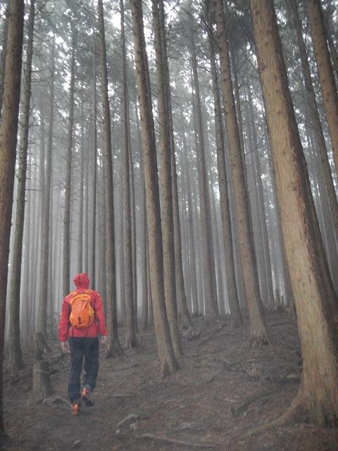 しかしそういう天気でも楽しいものです。ガスに包まれて幻想的なヒノキの植林帯やカヤ場も、天気がいい時では味わえない雰囲気です。とはいえ、やっぱりススキが綺麗な秋に行ってみたいですね。