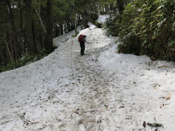 稜線はほぼ雪解けをしているものの、日陰部分は凍っており