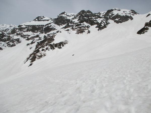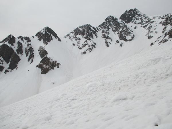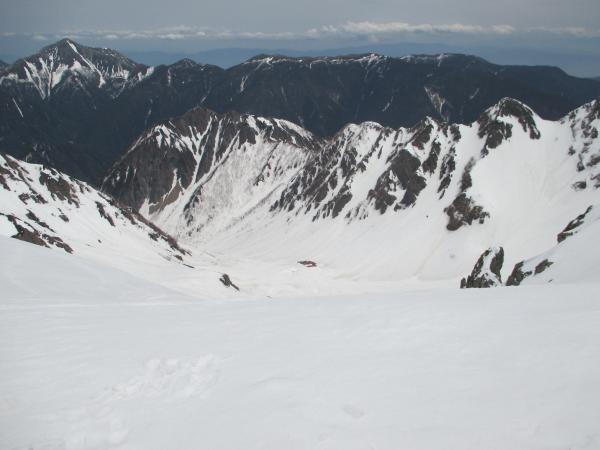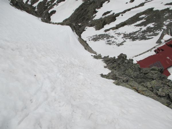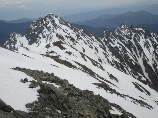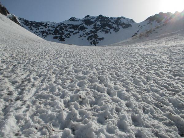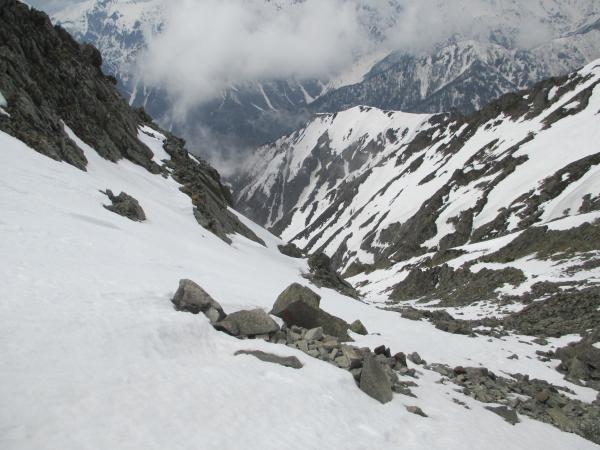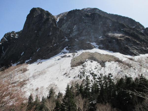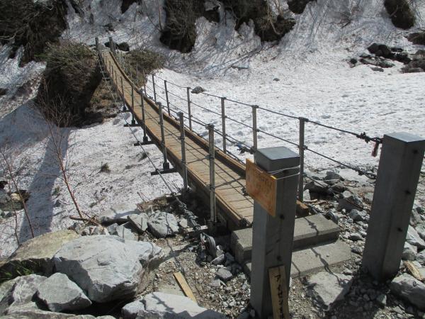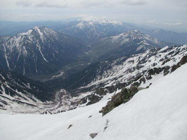 - 上高地―横尾間はほとんど積雪はありません。涸沢手前の本谷橋を渡ってからは雪上歩行になります。涸沢から奥穂高岳にかけては10本あるいは12本爪アイゼン、ピッケルが必要です。穂高岳山荘からの登りと頂上手前の間違い尾根の雪壁が急勾配で、凍っている場合などにはダブルアックスやロープを使用しないと危険です。また、降雪後は雪崩に注意が必要です(穂高岳山荘から本谷橋まで下山している間に北穂高岳の方で6,7回ほど雪崩が起きました)。