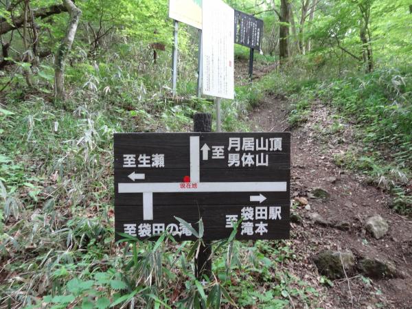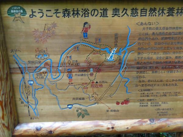 - 袋田の滝無料駐車場(20分)袋田の滝(30分)前山(10分)月居観音堂(10分)月居山(15分)林道分岐(50分)袋田の滝無料駐車場