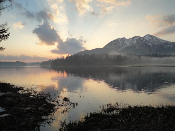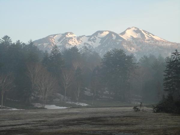 雨がおさまったのを見計らい、水芭蕉や尾瀬沼からの燧ヶ岳を見に外へ出ました。燧ヶ岳が夕陽に染まるのが午後6時過ぎ、沼はもやがかかり幻想的です。ここは星空も素晴らしいようです(寝てました)。