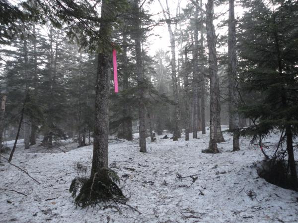 早朝4時過ぎに小屋を出て、無理せず俎ぐらまで行って引き返す予定でしたが、雪のついた樹林帯はアイゼンなしでも歩きやすく、ピンクのテープがしっかり巻かれていたので迷うこともなく3時間程で到着。俎ぐらから柴安ぐら間は雪が深く急登、両手をつきながら一歩一歩キックステップで登り下りしました。山頂は風もなく景色を十分に楽しめます。