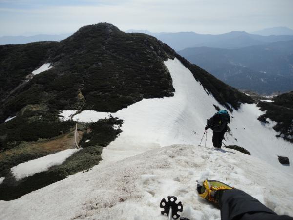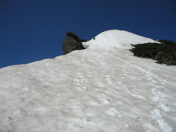 俎ぐら手前は岩肌が出ています。雪解け水が流れ滑りやすいです。