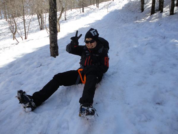 - 前日の雨とで雪は緩んでいます。踏み抜き注意。