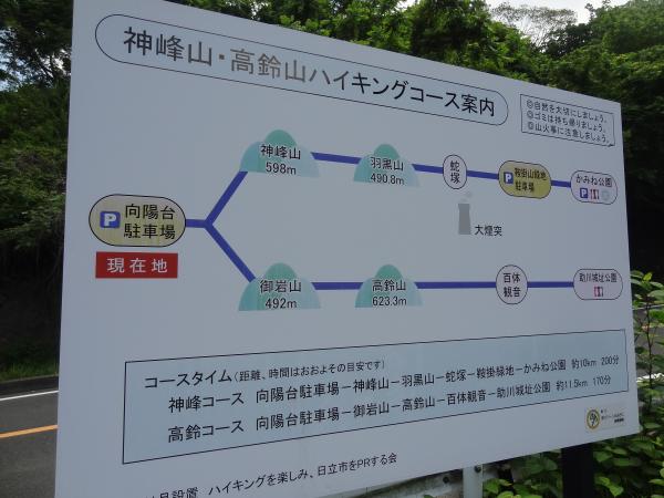 - 向陽台駐車場(10分)高鈴山登山口(30分)御岩山分岐(5分)御岩山(15分)向陽台分岐(5分)高鈴山(5分)向陽台分岐(15分)御岩山分岐(25分)高鈴山登山口