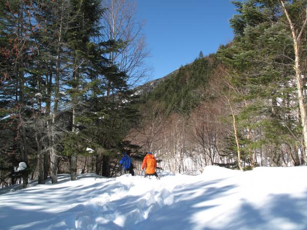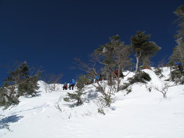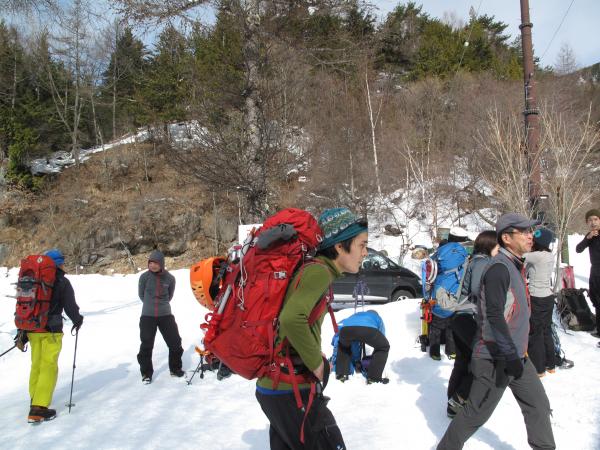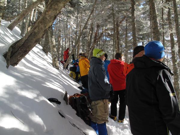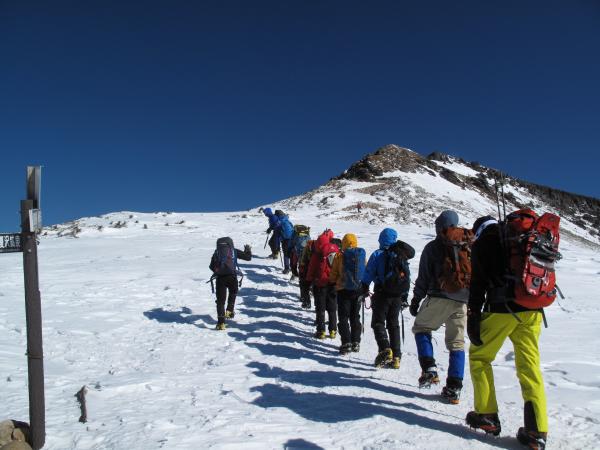 初日は赤岳鉱泉付近でアイゼン歩行・ラッセル訓練を行い、2日目は硫黄岳登頂を果たし、ビーコンの操作方法等を学びました。