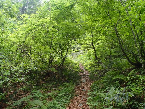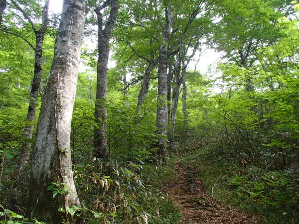 梅雨の中休みでしょうか、この晴れ間に白山釈迦岳へ出かけました。このルートもチブリ尾根と同様ブナの美しい林の中を歩いていきます。平日のため入山している人はほとんどいないので熊よけの鈴の音と鳥のさえずりだけの静かな山歩きとなりました。6月も中旬、さすがにこのルートも残雪はほとんど無く1,2か所だけで夏道がしっかりと出ているので、雪による道迷いの心配はなさそうです。白山釈迦岳から七倉の辻までの釈迦新道後半はまだ残雪が頂上から見えるのでこの先に行かれる方はまだしばらくアイゼン等足元の装備が必要だと思います(時間帯、気象条件でかなり異なる)。