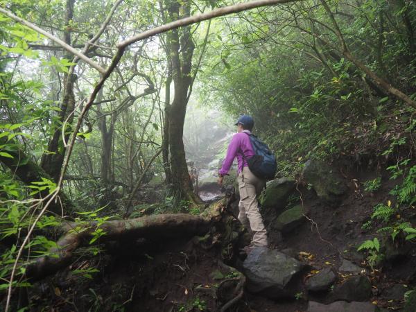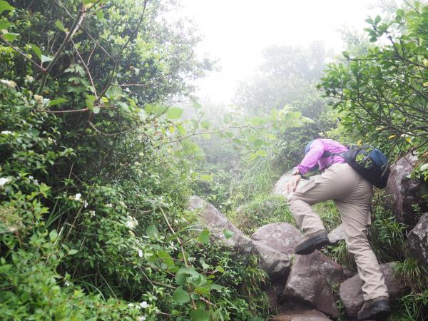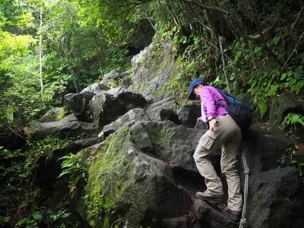 六合目を過ぎてから岩場が増えてきてさらに足元が湿っているので滑らないように注意してください。