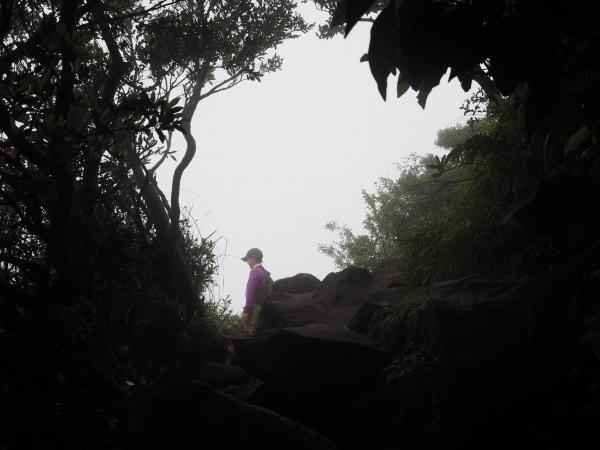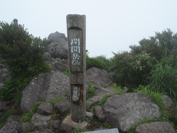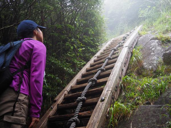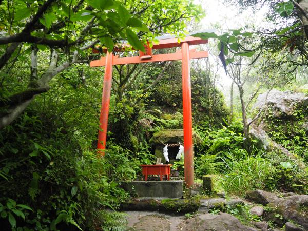 最初は火山礫のザラザラした登山道。侵食も進みえぐれたようになっています。ここは一合目から合目ごとにしっかりした道標があり、どこまで登ってきたかあとどれくらいかがよく分かります。身体を温めつつペースよく進むと視界が開ける五合目に到着。おぉ、気持ちいい!五合目を過ぎたあたりから日差しの反対側にまわってきたのかうっそうをしてきました。だんだんと岩が増えてきて足場が悪くなってきます。おまけに雲行きが怪しくなってきて、、、七合目の先で見事な展望が開けるはずが残念ながら真っ白。その先も岩場が続き急ハシゴを登り最後のひと登り。山頂直下の鳥居で手を合わせ開聞岳山頂に到着!!真っ白!!!360度の展望があるはずが、、、登ってきた屋久島が見えるはずが、、、残念でした。次回にリベンジ!!