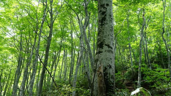 ブナオ峠から登りだしてすぐに美しいブナ林が始まります。歩きやすい道です。秋に再び訪れたいコースです。帰りに五箇山 赤尾地区にある「岩崎家」は必見です。