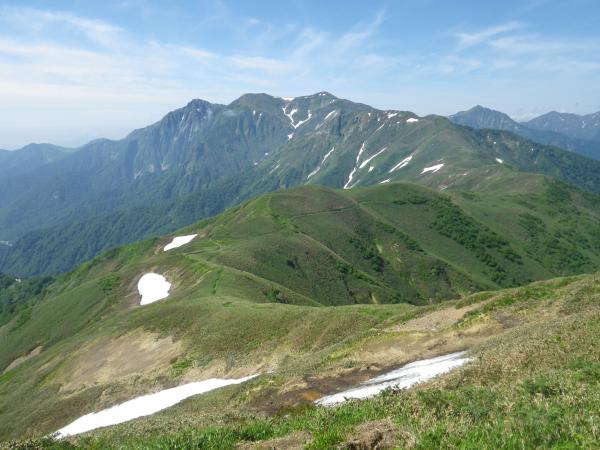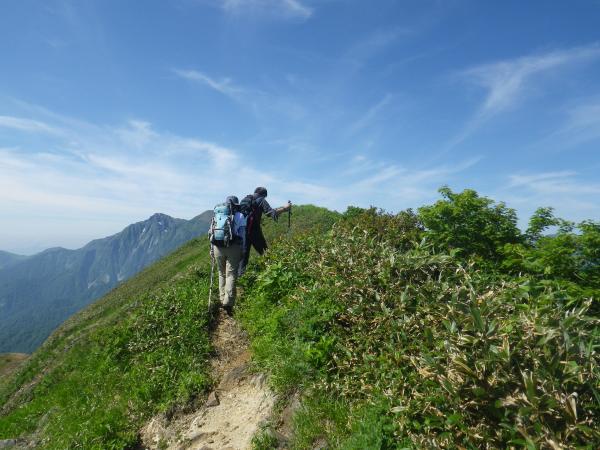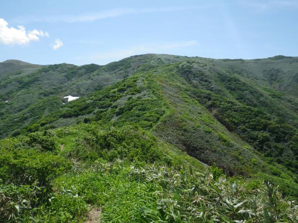 頂上より鎖を使って下ります。小さなアップダウンを繰り返し笹原に出ます。