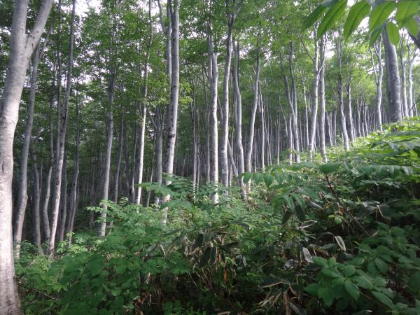 この日は井戸尾根ピストン、初級者コースとはいえ、行程は短くはないので登り応えはありました。前日の雨のせいで、私の最も苦手なドロドロ滑り易い道になっていました。何とか五合目・焼松まで辿り着くと、展望が開けて米子沢の滝が正面に見えてきます。さらに右手には上越のマッターホルン・大源太山が。槍ヶ岳に勝るとも劣らぬカッコ良さです。そこから先のブナ林も見事でした。整然と並ぶ白い幹にはうっとり見とれてしまう程でした。ブナには人に元気を与えてくれる見えない力が宿っているような気がします。