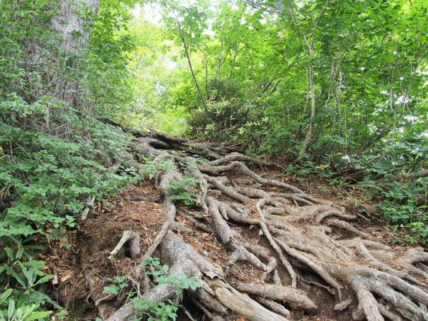 ジャンクションピークを越えると足元が滑りやすい痩せ尾根。